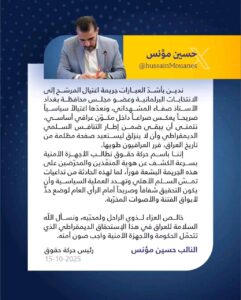 أدان النائب حسين مؤنس، رئيس حركة حقوق، حادثة اغتيال المرشح لانتخابات مجلس النواب وعضو مجلس محافظة بغداد صفاء المشهداني، واصفاً إياها بأنها “اغتيال سياسي صريح” يعكس تصاعد الصراع داخل المكوّن السني.