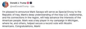 أعلن الرئيس الأمريكي دونالد ترامب عن تعيين مارك سافايا، وهو من أصول عراقية، مبعوثاً خاصاً للولايات المتحدة إلى العراق.