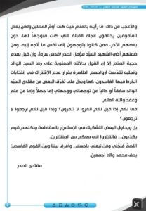 وأضاف أنه رأى في منامه أنه كان يؤمّ المصلين، لكن بعضهم كان يصلي باتجاه مغاير للقبلة، واعتبر أن ذلك يرمز إلى تفرّق بعض أتباع والده المرجع الراحل محمد صادق الصدر عن النهج الذي أسسه، سواء عن جهل أو عن قصد، مشيراً إلى أن المرحلة تتطلب الثبات على المبدأ وعدم الانجرار وراء المصالح أو الصراعات السياسية.